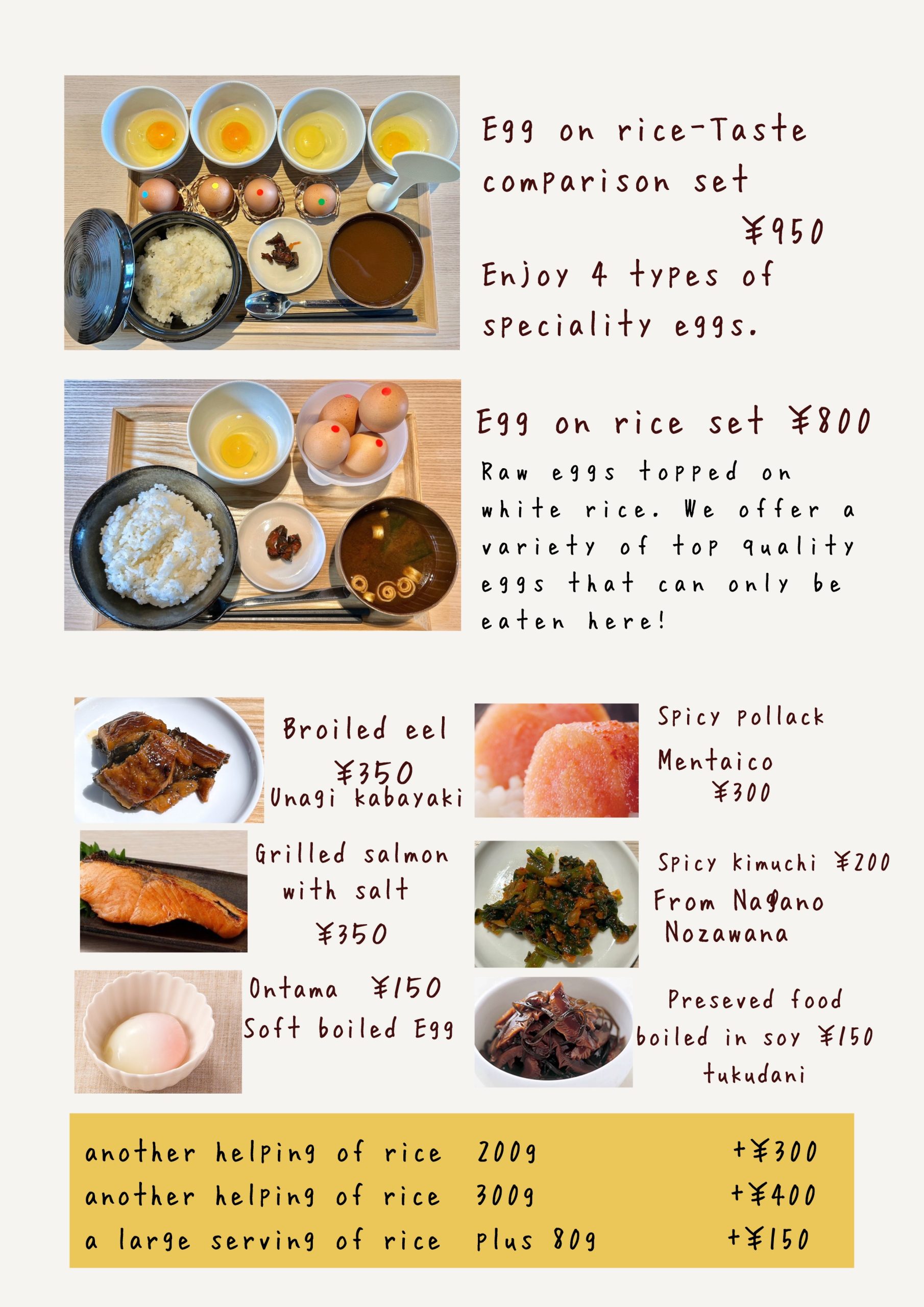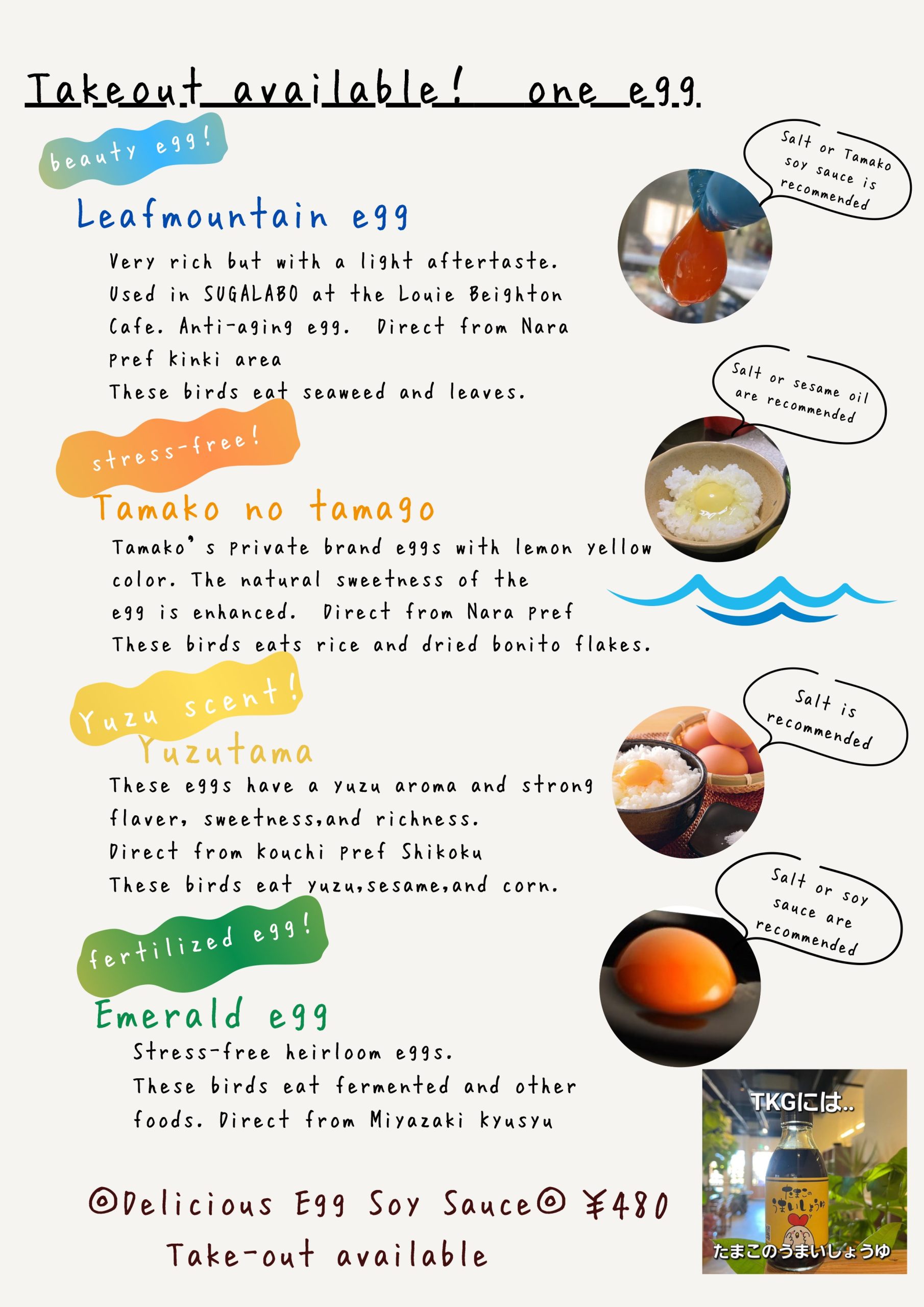 We highly recommend our “3-Egg Tasting Set,” where you can savor the unique characteristics of different egg varieties. Discover the rich yolk and fluffy whites of our eggs.