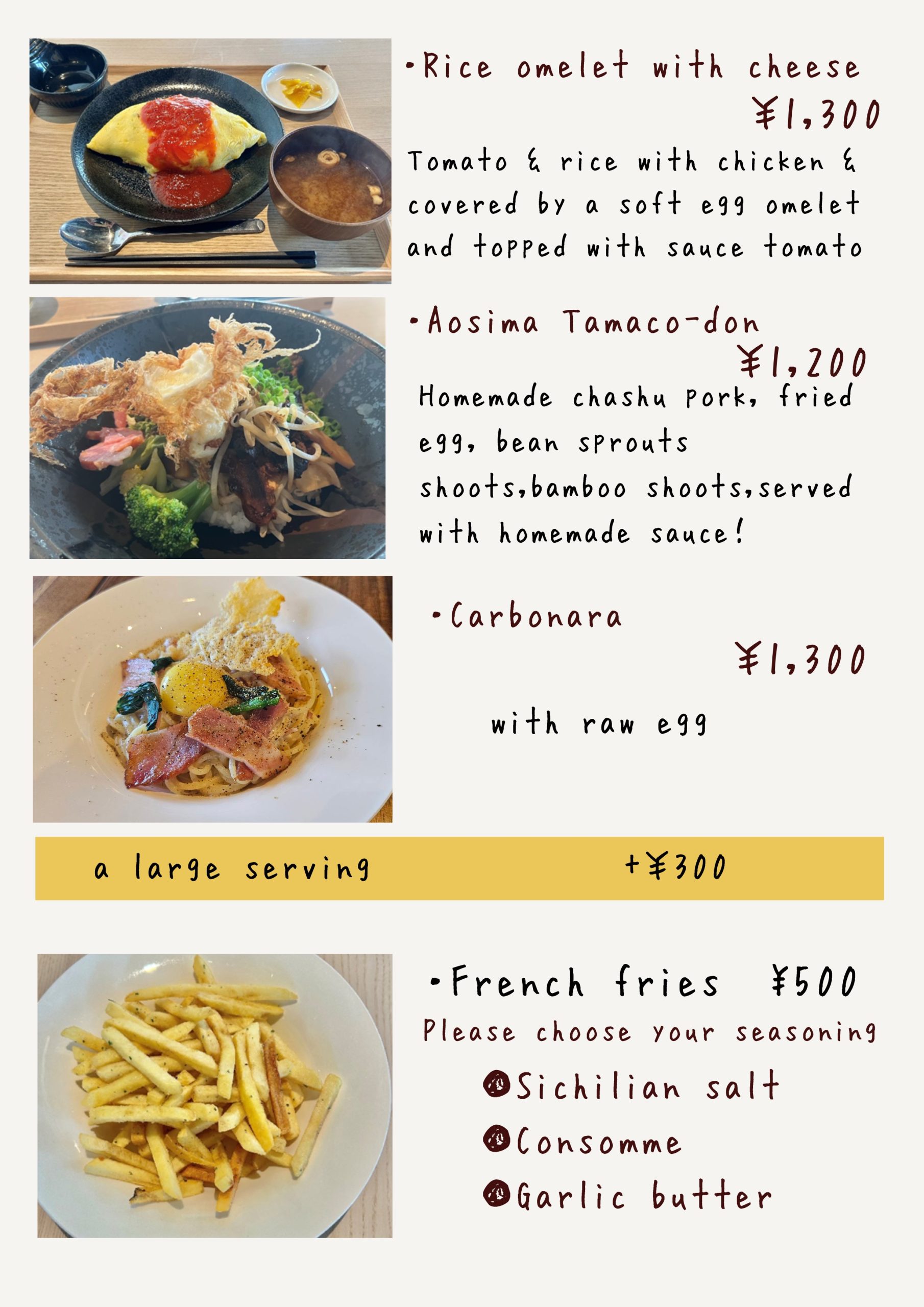 We offer a relaxing experience with our egg-centric dishes, surrounded by the peaceful atmosphere of Aoshima. Our menu features carefully selected eggs, such as free-range and fertilized eggs, ensuring a rich and flavorful taste in every bite.