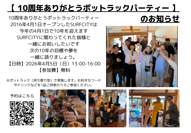4月052026 SURFCITY10周年ありがとうポットラックパーティー イベントタグ 10周年記念ありがとうポットラックパーティー 10周年記念を記念して、クラブハウス内でポットラックパーティーを実施します! 途中参加も途中退出も自由です。 美味しいフードと仲間と目標や夢を一緒に語りましょう。 定員:30名 参加費:無料 ※ポットラック(持ち寄り型)で実施します。お好きなフードやドリンクなどを1品ご持参のうえご参加ください。 マイ箸、マイ皿、カップも持参でお願いします。 ーーーーーーーーーーーーーーーーーーーーーーーーーーーーーー 【問い合わせ】 SURFCITY 宮崎 〒889-2162 宮崎県宮崎市青島2−1−11 TEL:050-3571-3238 MAIL:support@surfcity-miyazaki.jp 【営業時間】 火〜金:9:00-22:00、土日祝:7:00-18:00 休館日:月曜日(月曜日が祝日の場合は翌火曜日が休館日です) 休館日中のお問い合わせは、メールにてメッセージをお送りください。営業日にご返信させて頂きます。またメールアドレス指定受信やドメイン指定受信可能(@surfcity-miyazaki.jp)などのご対応もご一緒にお願い致します。数日経ってもご返信がない場合は、お手数ですが直接お電話にてお問い合わせください。 引用させていただきました: https://surfcity-miyazaki.jp/archives/10095 名称ありがとう10周年 ポットラックパーティー 日時2026年4月5日(日) 13:00〜16:00 場所SURFCITY 宮崎 〒889-2162 宮崎県宮崎市青島2−1−11 予約https://surfcity-miyazaki.jp/archives/10095# ウエブサイトwebsiteinstagram お問い合わせSURFCITY 宮崎 〒889-2162 宮崎県宮崎市青島2−1−11 TEL:050-3571-3238 MAIL:support@surfcity-miyazaki.jp