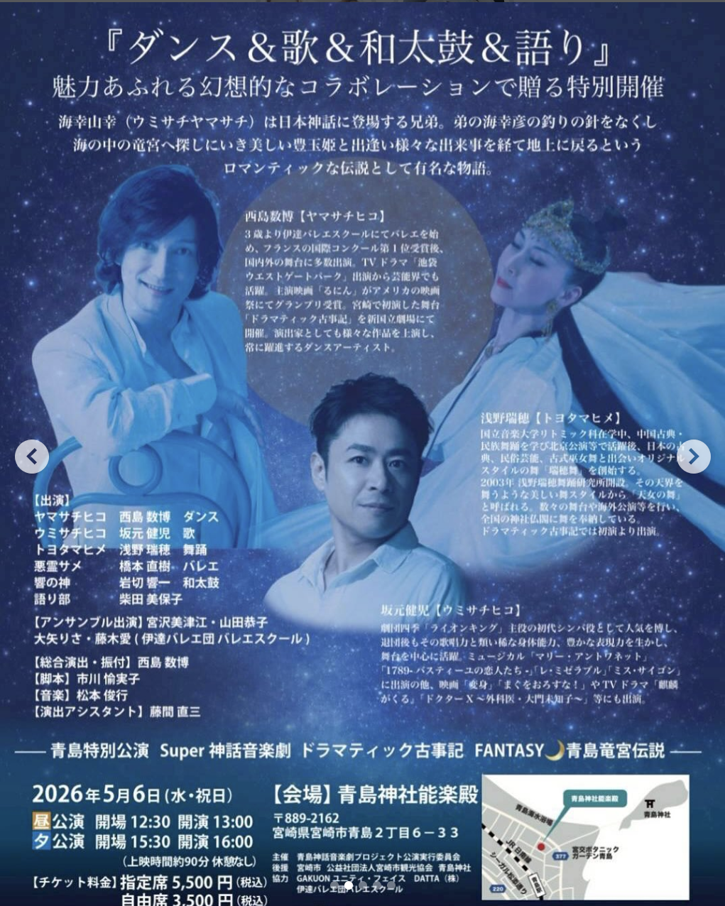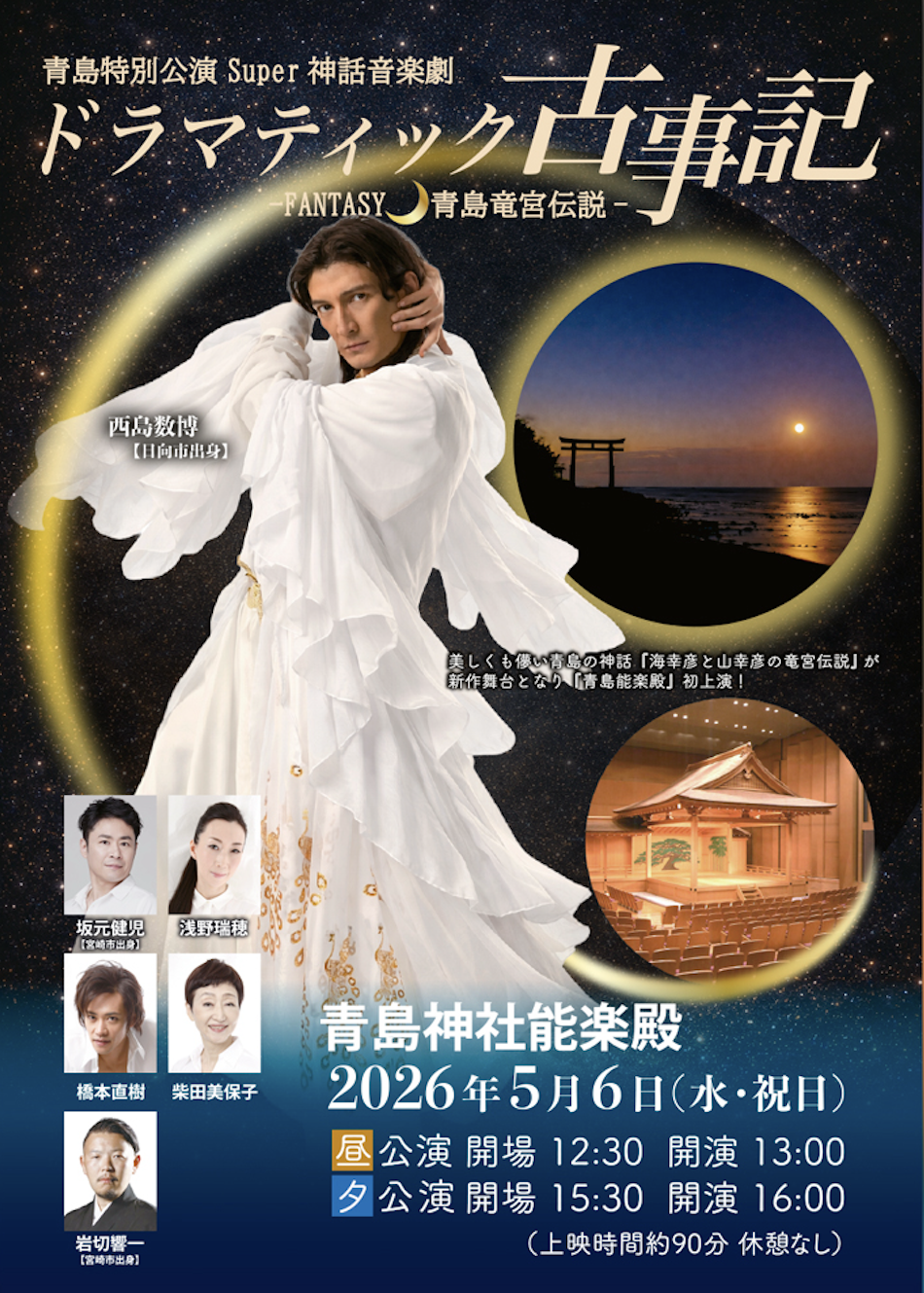 5月062026 ドラマティック古事記ーFANTASY 青島竜宮伝説ー 青島神社で幻想的な神話の舞台青島特別公演 Super 神話音楽劇 ドラマティック古事記ーFANTASY 青島竜宮伝説ー 青島の神聖な空間・青島神社 能楽殿で、特別公演が開催されます。 タイトルは 「Super 神話音楽劇 ドラマティック古事記 ― FANTASY 青島竜宮伝説 ―」 テーマは 「ダンス&歌&和太鼓&語り」 ジャンルを超えた表現が融合する、幻想的な舞台です。 魅力あふれるコラボレーションによって、日本神話の世界をダイナミックに描きます。 日本神話「海幸山幸」を題材にした物語 今回の舞台は、日本神話に登場する兄弟の物語 「海幸山幸(ウミサチヤマサチ)」がテーマ。 弟の海幸彦の釣り針をなくしてしまった山幸彦が、 それを探して海の中の竜宮へ向かうことから物語が始まります。 そこで出会うのが、美しい豊玉姫(トヨタマヒメ)。 竜宮での出来事やさまざまな試練を経て、再び地上へ戻る―― そんなロマンティックで幻想的な神話が、舞台芸術としてよみがえります。 青島という神話の空気を感じる場所で体験する、特別な公演です。 引用:https://gakuon.co.jp/ec/html/products/detail/326 名称青島特別公演 Super 神話音楽劇 ドラマティック古事記ーFANTASY 青島竜宮伝説ー 公演日2026年5月6日(水・祝) 開場・開演昼12:30・13:00 夕15:30・16:00 会 場 青島神社能楽殿 住 所〒889-2162 宮崎県宮崎市青島2丁目6−33 席 種指定席 5,500円 自由席 3,500(税込) 出 演西島数博/坂元健児/浅野瑞穂/橋本直樹/柴田美保子/岩切響一