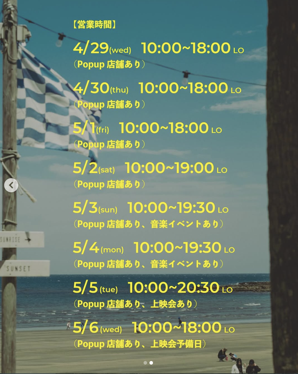 5/4(mon) 10:00~19:30 LO(Popup店舗あり、音楽イベントあり🎸)