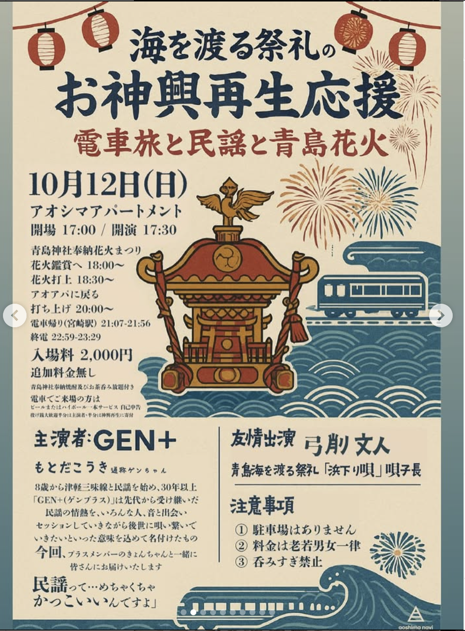 ー海を渡る祭礼のお神輿再生応援ー電車旅と民謡と青島花火本祭