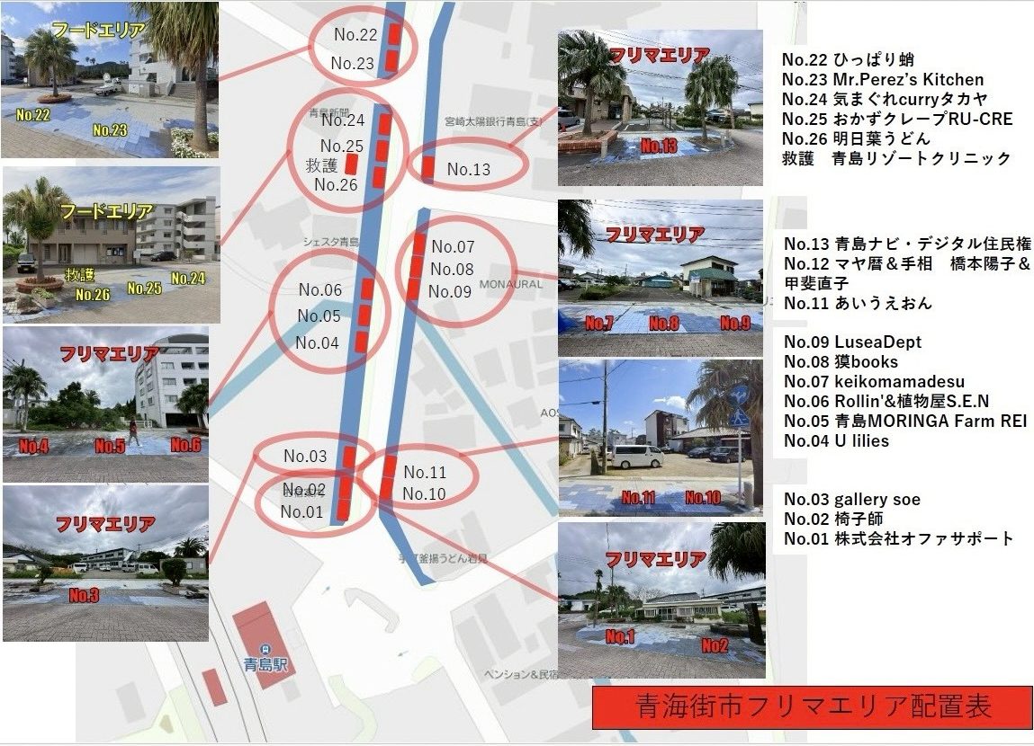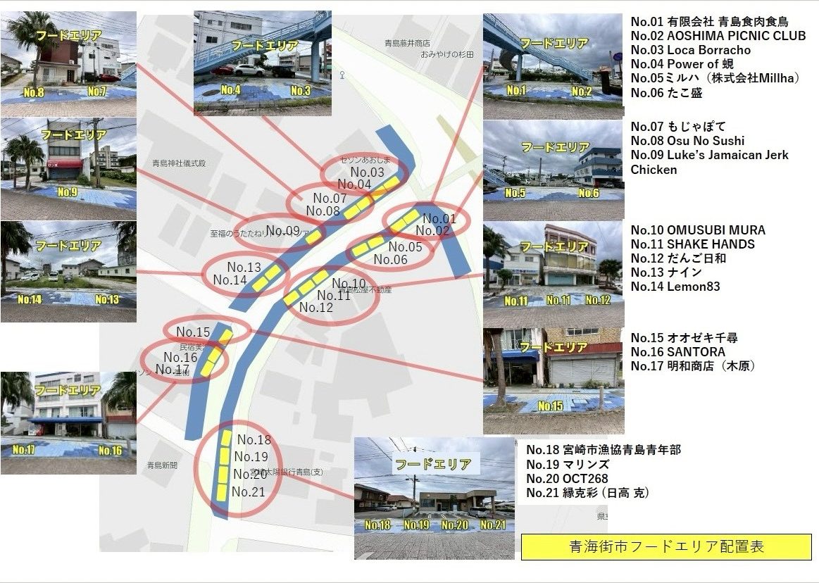 会場となる青島駅前通りから歩道橋の前まで(歩行者天国エリア)の出店配置図が完成しました。南国情緒あふれる駅前通りに、活気が溢れます(※一部変更の可能性あり)。