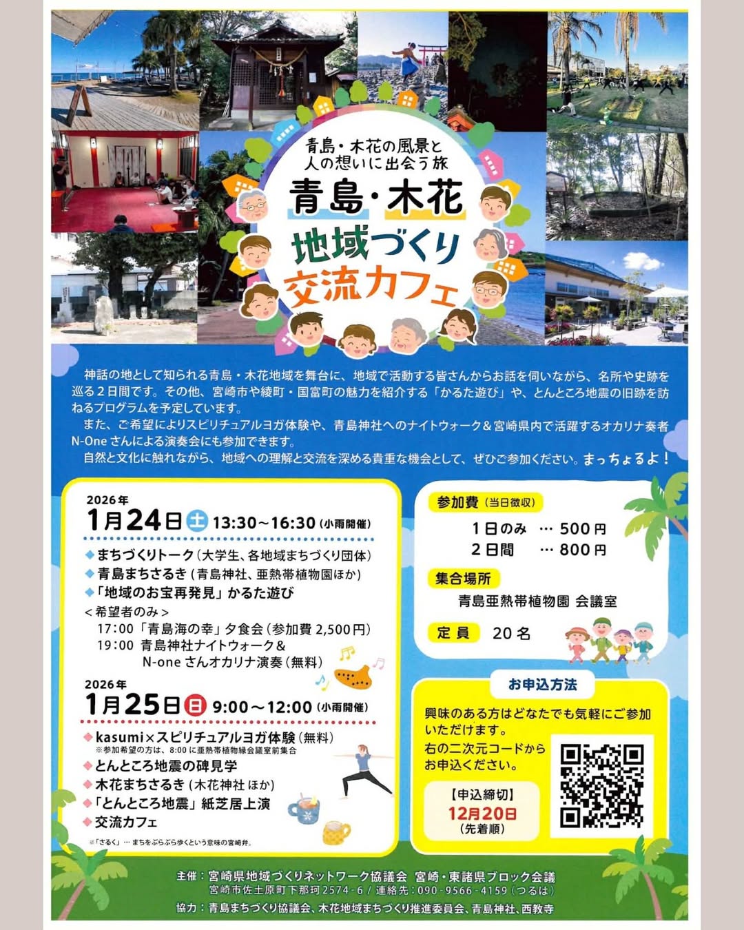 1月252026 【1月25日(日):木花編】青島・木花 地域づくり交流カフェ ~青島・木花の風景と人の想いに出会う旅~ 青島・木花 地域づくり交流カフェ 【1月25日(日):木花編】 ~青島・木花の風景と人の想いに出会う旅~ 2日目は木花地域を中心に、心身をリフレッシュするヨガ体験や、地域の歴史を学ぶ碑の見学、紙芝居などを行います。地域の理解と交流を深める貴重な機会です。ぜひご参加ください。 日時: 2026年1月25日(日)9:00〜12:00(小雨開催) 集合場所: 青島亜熱帯植物園 会議室 内容: kasumi×スピリチュアルヨガ体験: 朝の心身を整えるヨガ(無料) ※9:00に亜熱帯植物園会議室前集合 とんところ地震の碑見学: 地域の歴史を巡る見学 木花まちさるき: 木花神社などを中心に巡ります 「とんところ地震」紙芝居上演: 地域の伝承を紙芝居で 交流カフェ: 参加者同士の交流タイム 参加費(当日徴収): 1日のみ:500円(2日間通し:800円) 定員: 20名 申込締切: 1月15日(木) 申込方法: チラシ記載のQRコードよりお申し込みください 主催: 宮崎県地域づくりネットワーク協議会 宮崎・東諸県ブロック会議 協力: 青島まちづくり協議会、木花地域まちづくり推進委員会、青島神社、西教寺 お問い合わせ: 090-9566-4159(つるは) どなたでも参加できます。 申込は、こちらから 👉https://x.gd/2YGaN 出典:https://www.instagram.com/p/DTIC3OcGAvV/ 日時2026年1月25日(日)9:00〜12:00(小雨開催) 集合場所青島亜熱帯植物園 会議室 参加費(当日徴収)1日のみ:500円 2日間通し:800円 締切り1月15日(木) 募集定員20名 申込方法どなたでも参加できます。 申込は、チラシのQRコードをスキャンするもしくは こちらから 👉https://x.gd/2YGaN 主催宮崎県地域づくりネットワーク協議会 宮崎・東諸県ブロック会議 お問い合わせ090-9566-4159(つるは) 協力青島まちづくり協議会、木花地域まちづくり推進委員会、青島神社、西教寺