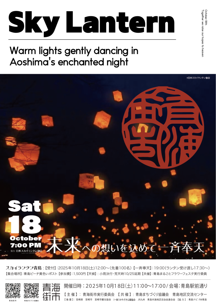 10月182025 スカイランタン青島 スカイランタン青島 【特別な夜の幕開け】スカイランタン青島 開催決定 青海街市が開催される2025年10月18日の夜、青島の空が柔らかな光で満たされます。 昼間のマーケットの賑わいから一転、潮騒が響くビーチエリアで幻想的なスカイランタンを打ち上げます。 空へと舞い上がる数多の光景は、青島の夜を優しく照らし、参加するすべての人々の心を繋ぎます。 未来への想いを込めて一斉奉天 ランタンにあなたの願いや未来への想いを込めて空へ放つ、感動的な瞬間。 どうぞ青島の夜空の下で、忘れられない特別な思い出をお作りください。 スカイランタン青島 参加詳細 青島の夜空を彩るランタンの打ち上げに、ぜひご参加ください。 事前予約 https://forms.gle/YbCLPocMDCwRnM6RA ※事前予約された方は17:00までで受付でお支払いしてください 【スカイランタンスケジュール】 12時〜 受付・ランタン絵付け体験開始 17:00受付終了 17:40ランタン絵付け体験終了 18:00ランタン引渡し開始 19:00合図とともに一斉奉天 ーー お願い ーー 受付終了前後は大変混雑することが予想されますので、お時間には余裕を持ってお越しください。 また会場の足元はたいへん暗くなりますのでご注意ください。 開催日: 2025年 10 月 18 日(土) 開催地: 青島参道商店街 時間:19:00から一斉奉天 料金:1,500円(当日支払い・現金のみ) お問い合わせ: aoshimachiikimachizukuri@gmail.com 天候: 小雨決行・荒天時は10月25日(土)に延期 【お申し込み】 詳細およびお申し込みは、プロフィール欄のリンクまたは青島ナビ公式アカウントにて後日改めてお知らせします。 青海街市(昼の部) 開催概要 ランタンの前に、青島の過去・現在・未来をつむぐ海辺のマーケットもお楽しみください。 開催日時: 2025年10月18日(土) 11:00〜17:00 会場: 青島駅前通り 主催・共催・後援・協力団体 主催: 青海街市実行委員会 共催: 青島まちづくり協議会、青島地区交流センター、青島まるごとフラワーフェスタ実行委員 後援: 宮崎県、宮崎市、宮崎市観光協会、(一財)みやざき公園協会、JR九州、青島内海地区自治会連合会 協力: 青島ナビ、FM青島 【協力】 日本スカイランタン協会®JSA9MY5878P (https://www.skylanternassociation.com/) @skylanternassociation