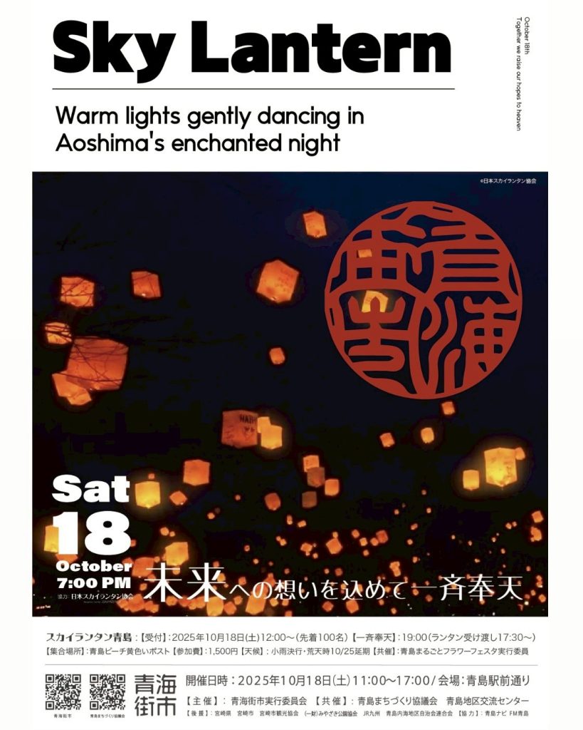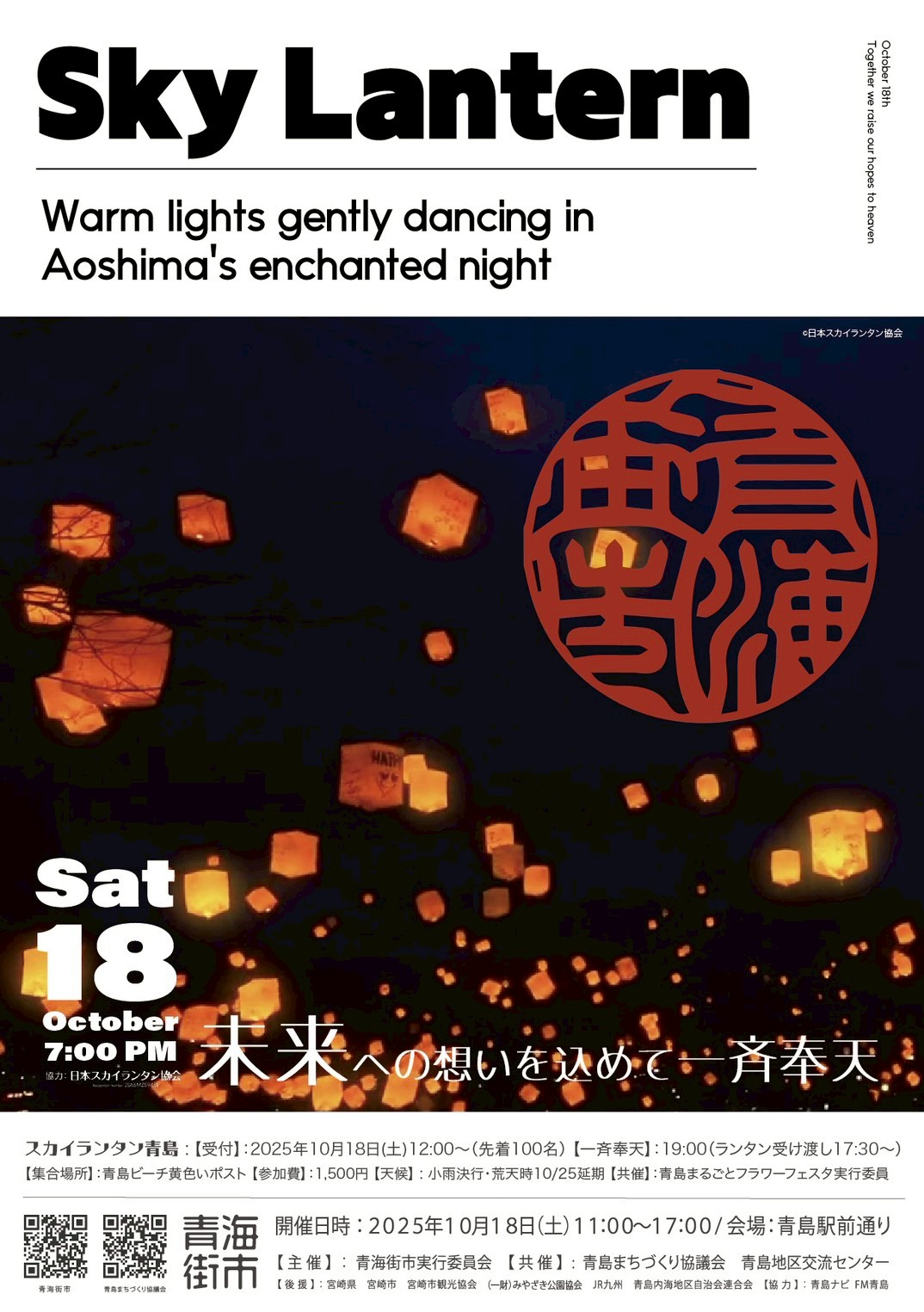10月182025 スカイランタン青島 イベントタグ スカイランタン青島 【特別な夜の幕開け】スカイランタン青島 開催決定 青海街市が開催される2025年10月18日の夜、青島の空が柔らかな光で満たされます。 昼間のマーケットの賑わいから一転、潮騒が響くビーチエリアで幻想的なスカイランタンを打ち上げます。 空へと舞い上がる数多の光景は、青島の夜を優しく照らし、参加するすべての人々の心を繋ぎます。 未来への想いを込めて一斉奉天 ランタンにあなたの願いや未来への想いを込めて空へ放つ、感動的な瞬間。 どうぞ青島の夜空の下で、忘れられない特別な思い出をお作りください。 スカイランタン青島 参加詳細 青島の夜空を彩るランタンの打ち上げに、ぜひご参加ください。 事前予約 https://forms.gle/YbCLPocMDCwRnM6RA ※事前予約された方は17:00までで受付でお支払いしてください 【スカイランタンスケジュール】 12時〜 受付・ランタン絵付け体験開始 17:00受付終了 17:40ランタン絵付け体験終了 18:00ランタン引渡し開始 19:00合図とともに一斉奉天 ーー お願い ーー 受付終了前後は大変混雑することが予想されますので、お時間には余裕を持ってお越しください。 また会場の足元はたいへん暗くなりますのでご注意ください。 開催日: 2025年 10 月 18 日(土) 開催地: 青島参道商店街 時間:19:00から一斉奉天 料金:1,500円(当日支払い・現金のみ) お問い合わせ: aoshimachiikimachizukuri@gmail.com 天候: 小雨決行・荒天時は10月25日(土)に延期 【お申し込み】 詳細およびお申し込みは、プロフィール欄のリンクまたは青島ナビ公式アカウントにて後日改めてお知らせします。 青海街市(昼の部) 開催概要 ランタンの前に、青島の過去・現在・未来をつむぐ海辺のマーケットもお楽しみください。 開催日時: 2025年10月18日(土) 11:00〜17:00 会場: 青島駅前通り 主催・共催・後援・協力団体 主催: 青海街市実行委員会 共催: 青島まちづくり協議会、青島地区交流センター、青島まるごとフラワーフェスタ実行委員 後援: 宮崎県、宮崎市、宮崎市観光協会、(一財)みやざき公園協会、JR九州、青島内海地区自治会連合会 協力: 青島ナビ、FM青島 【協力】 日本スカイランタン協会®JSA9MY5878P (https://www.skylanternassociation.com/) @skylanternassociation