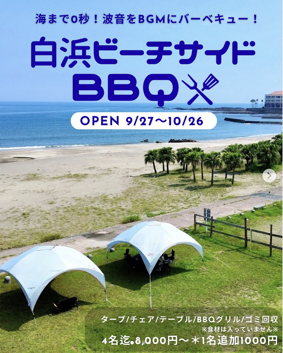 この秋「白浜ビーチサイドBBQ」 が期間限定で白浜海水浴場海の家跡地にOPENします!!