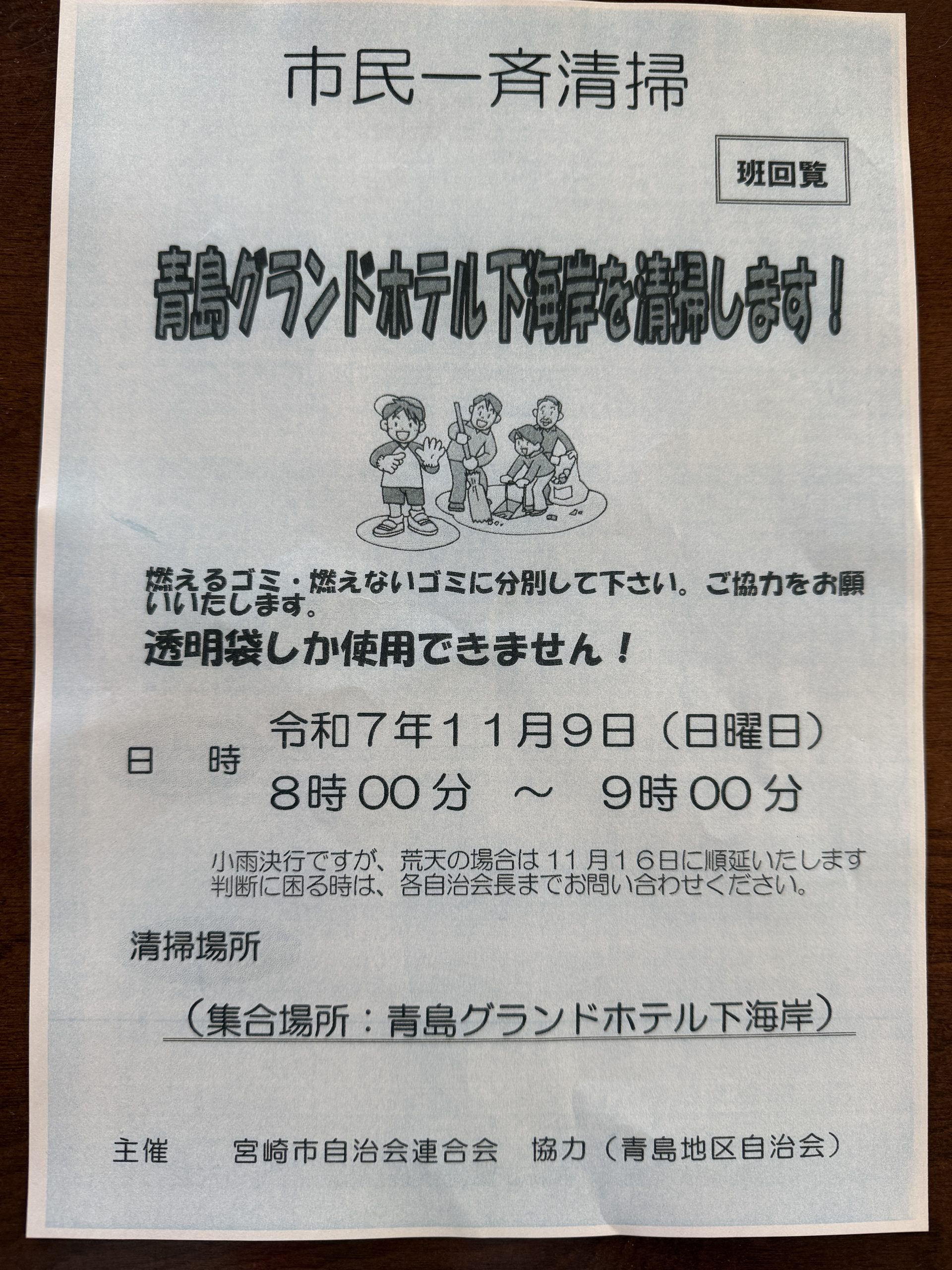 今週の日曜日は市民一斉清掃で青島グラントホテル下海岸の清掃を行います