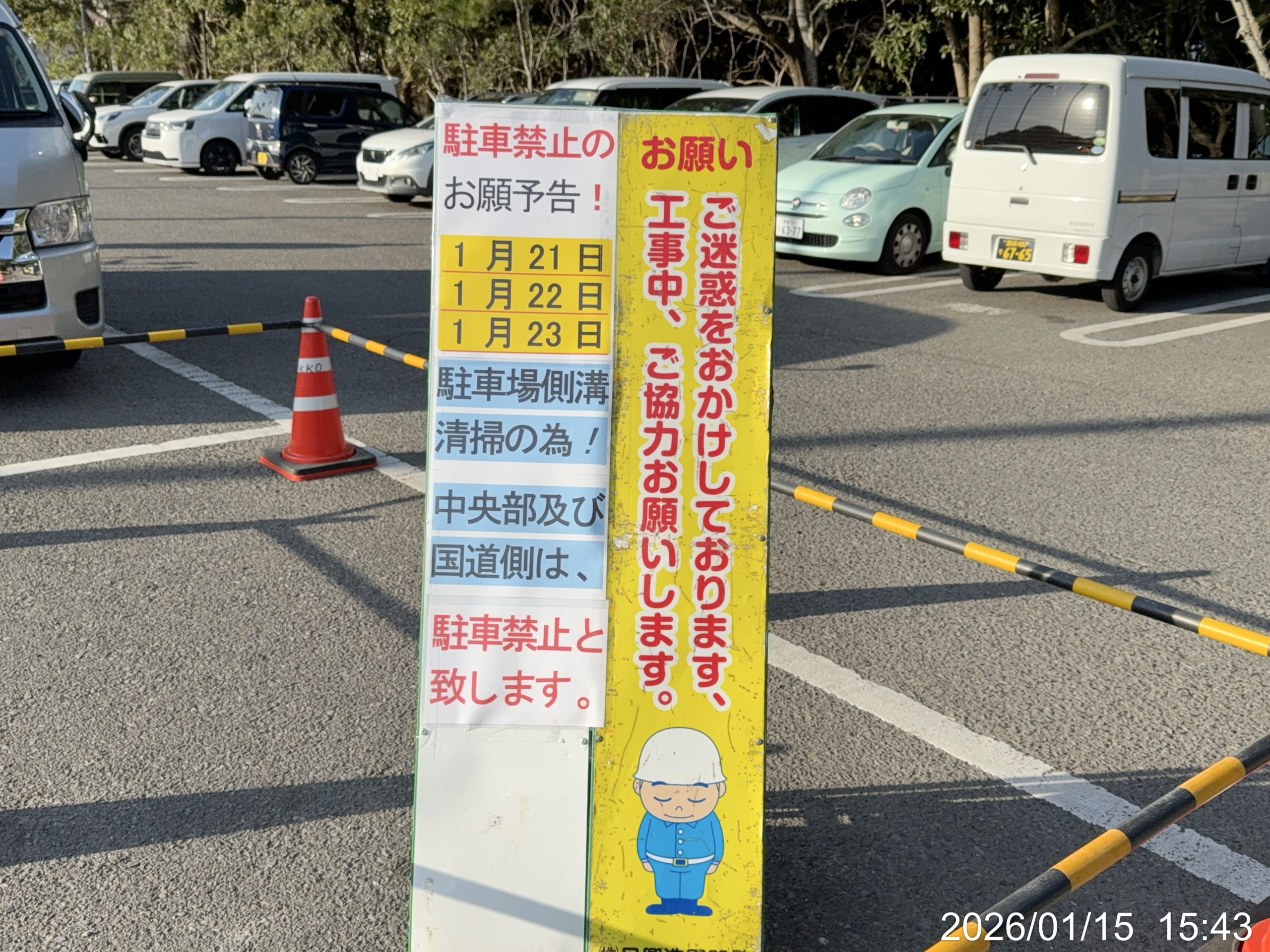 ANAホテル横の無料駐車場が1月21日、22日、23日の3日間駐車場の側溝の清掃の為中央部及び国道側が駐車禁止となります