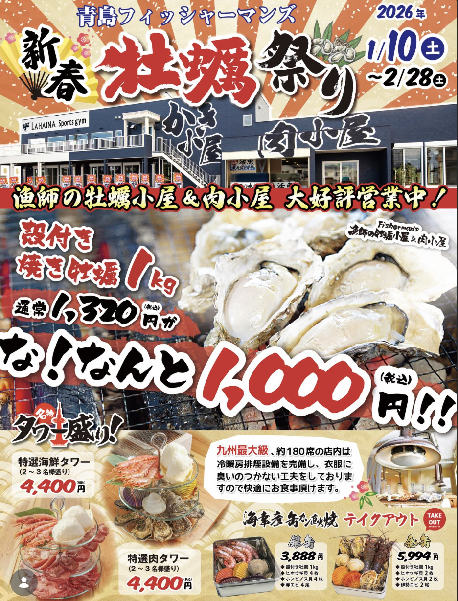【漁師の牡蠣小屋&肉小屋】牡蠣祭り2月28日まで開催!!