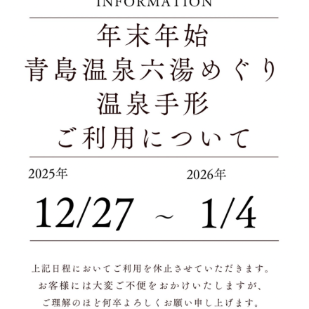 【青島フィッシャーマンズビーチサイドホステル】年末年始の青島温泉六湯めぐり温泉手形の利用につ...