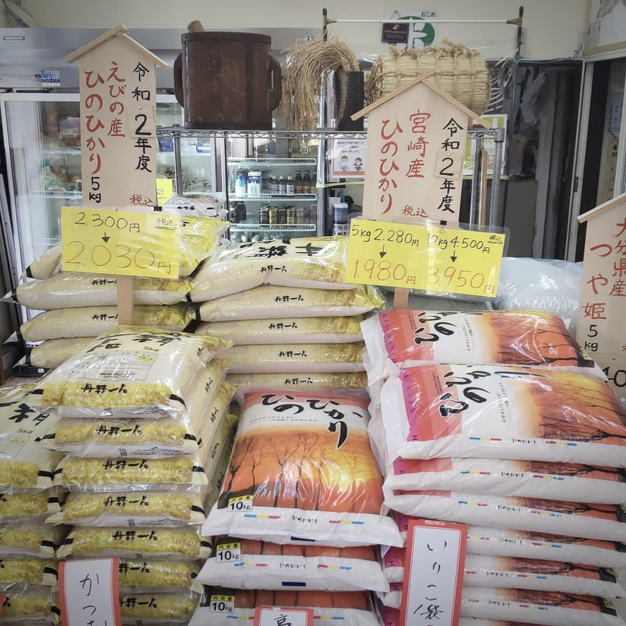 当店で取り扱うお米は、えびの産ひのひかりを主力商品に宮崎産(都城、西都地区)ヒノヒカリ、大分産つや姫。業務用米を取り扱っております。