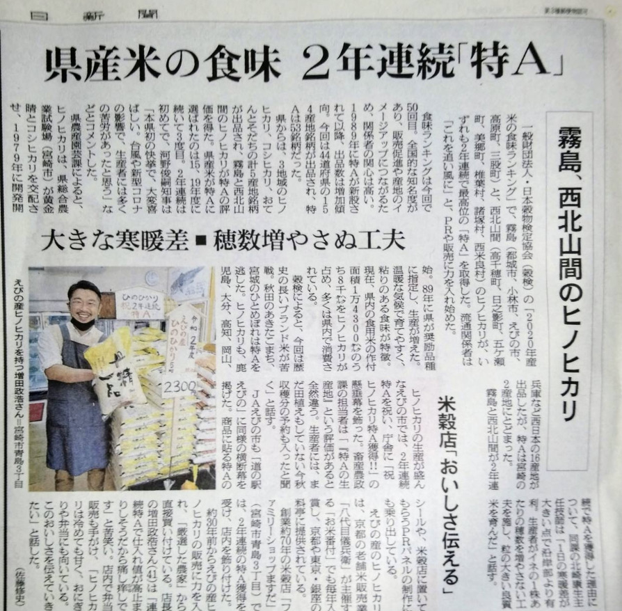 その絶え間ぬ努力の結果、令和元年、3年度と同地区のひのひかりが米の食味ランキング国内最上位の特Aを3年連続で取得しました!