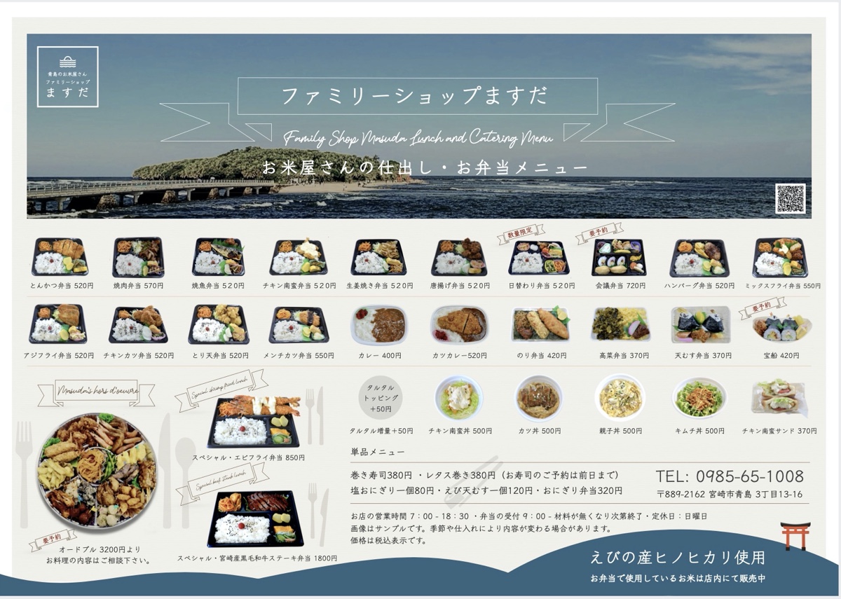 青島内のみ配達サービスあり、オードブル要相談、お弁当はなくなり次第終了ですのでお電話での確認をお勧めするそうです。